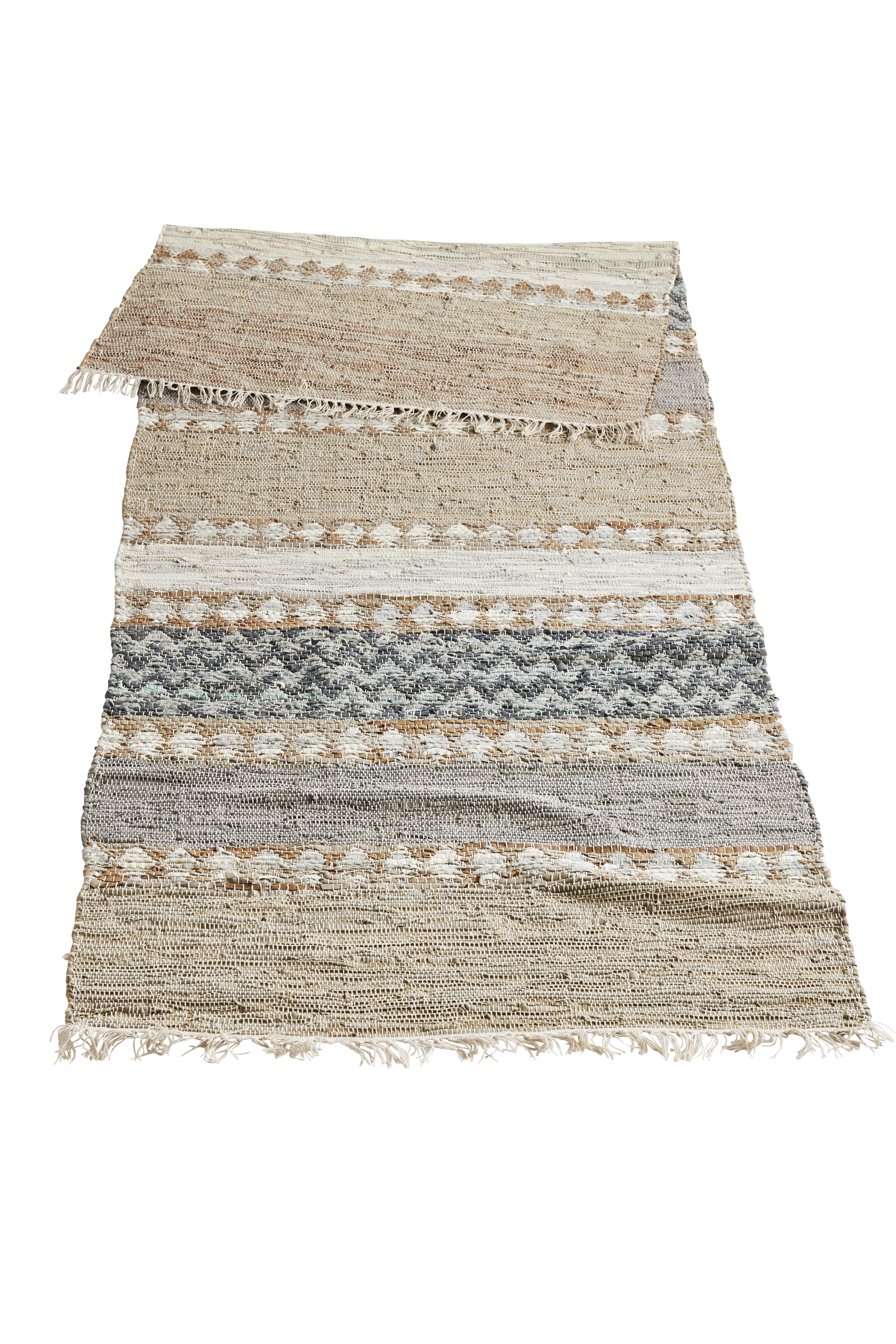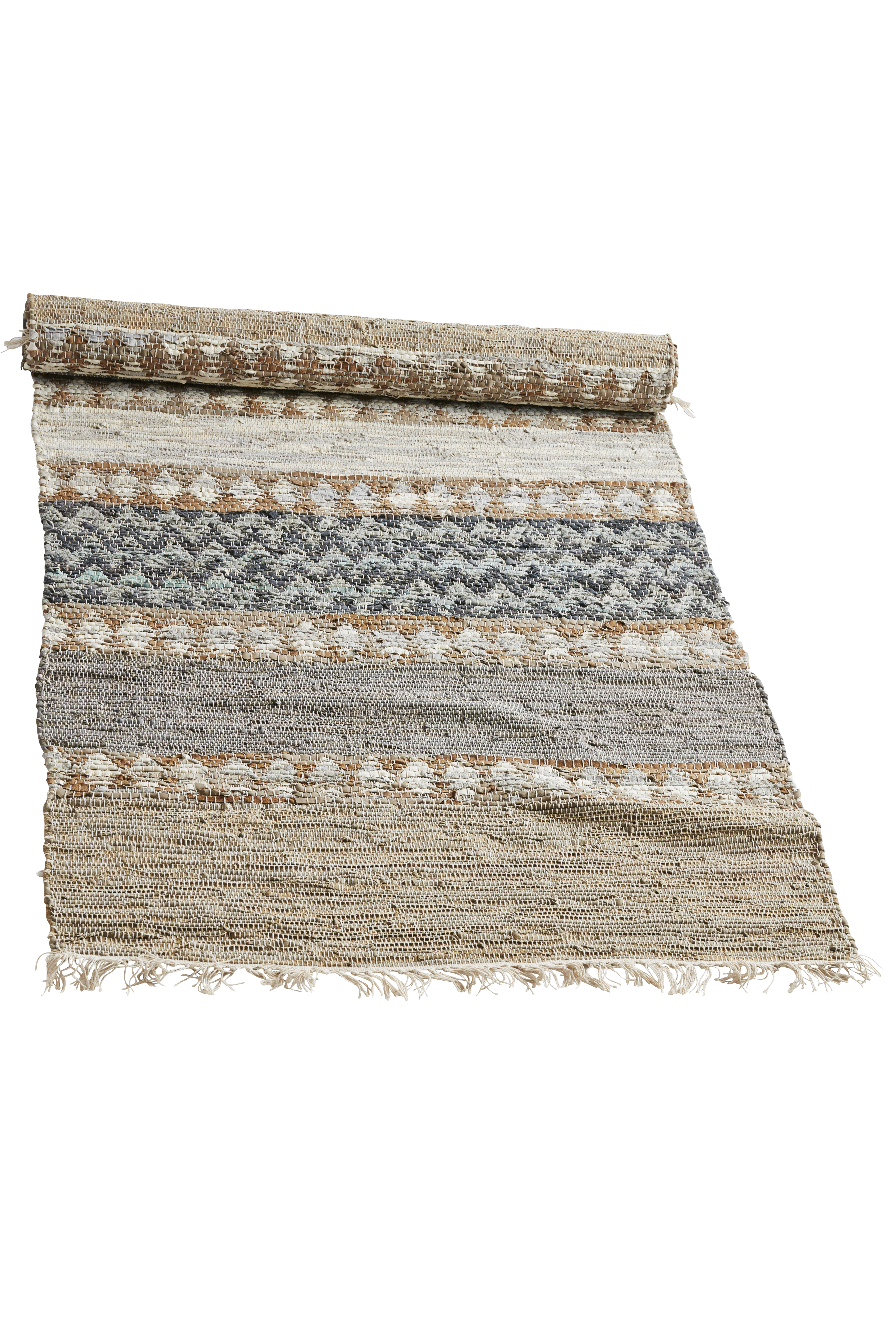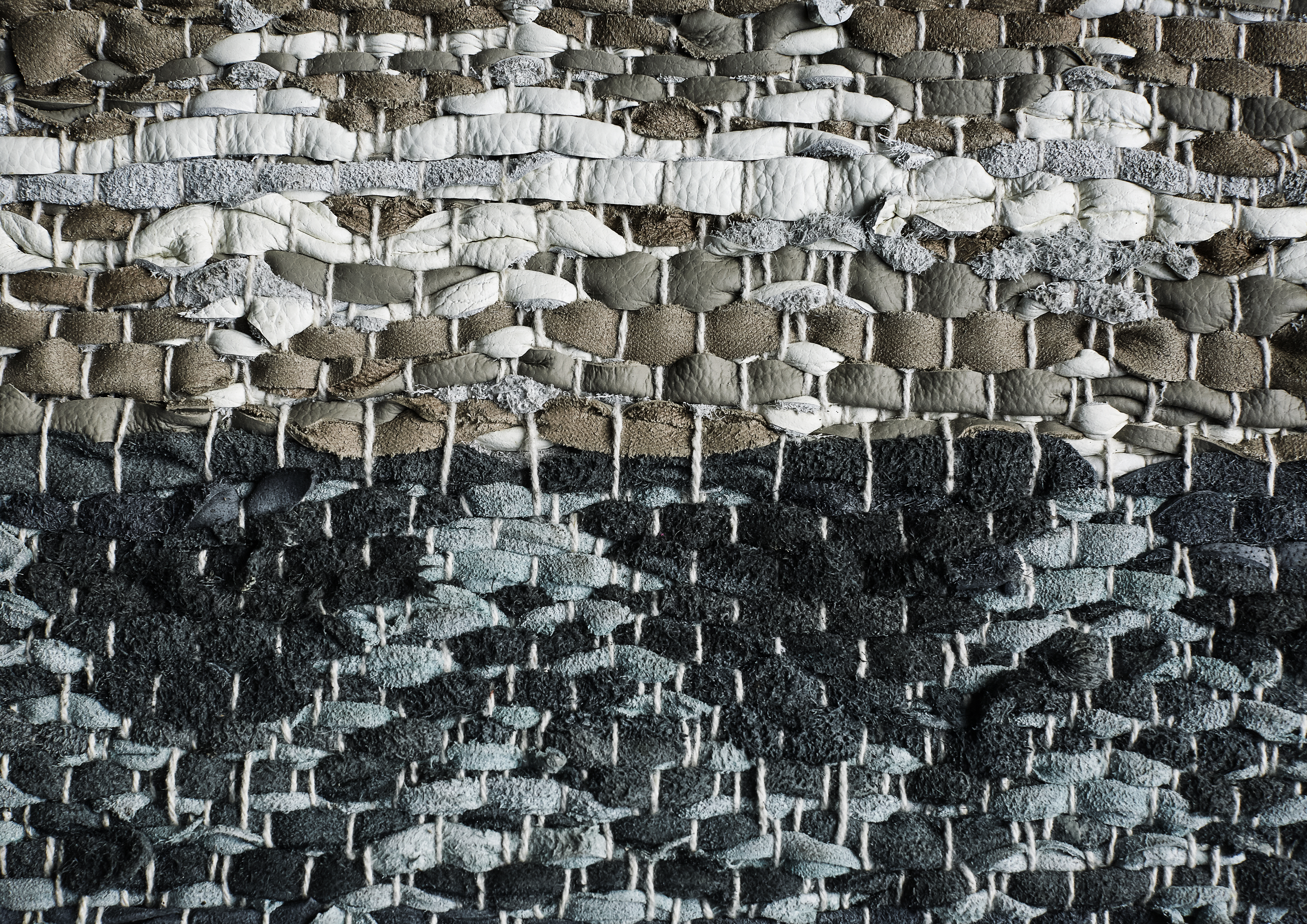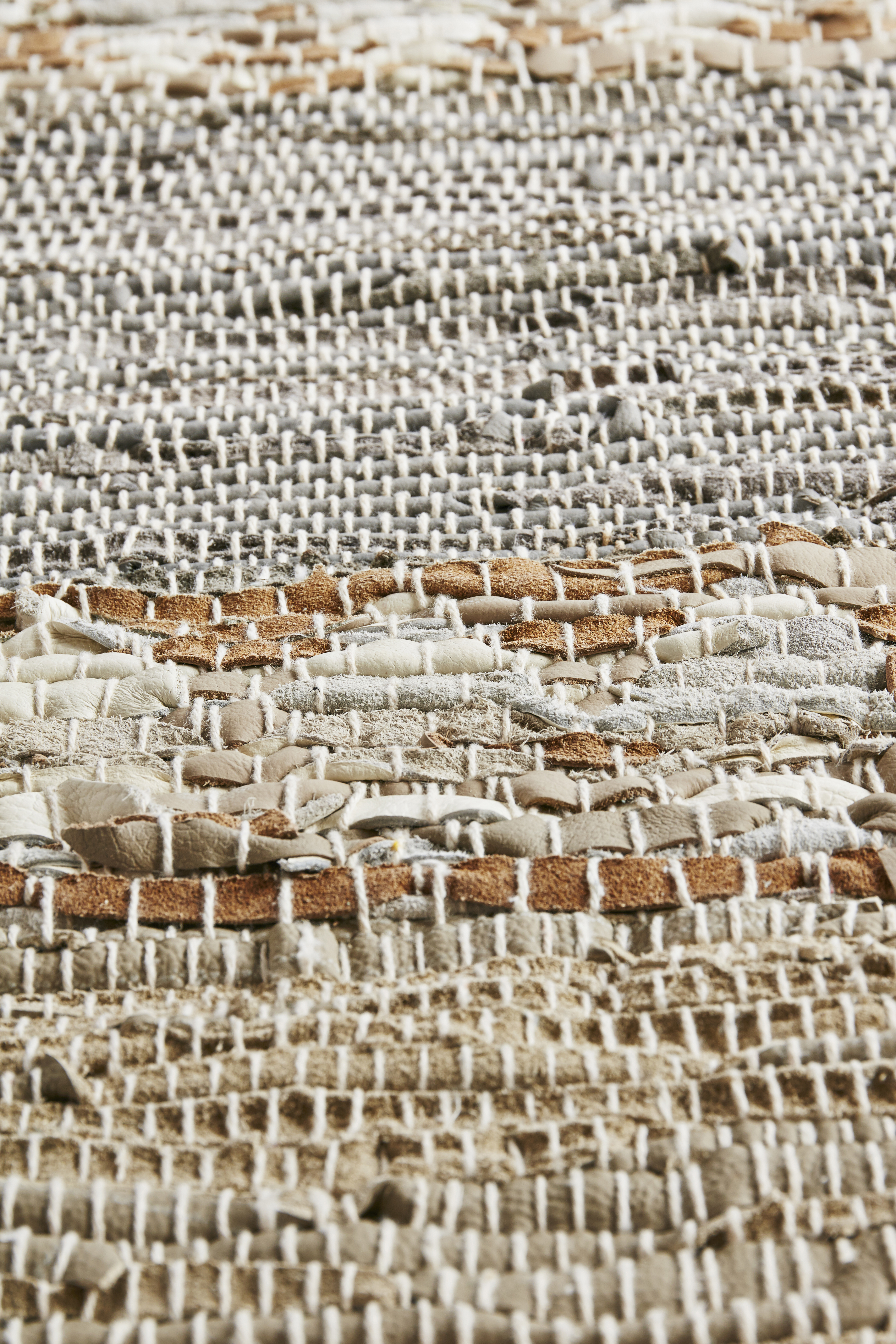 A large leather carpet in calming natural colors. The handwoven leather is a beautiful whole, created by multiple perfect imperfections. Looking closely at the carpet it is clear to see the handmade details that make each carpet a unique experience. The different sized leather strips, when woven together with the natural white thread, creates an exciting pattern that expresses the lapping of the waves. Use the leather rug to add a calming element to your space no matter if this is your bedroom, hall or your living room.